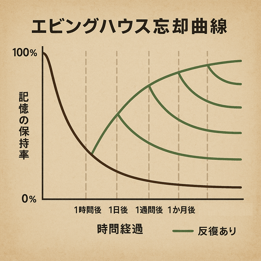学習したことは、時間が経てば忘れます。20分後には58%、1時間後には44%の内容しか覚えていないという研究結果もあります。